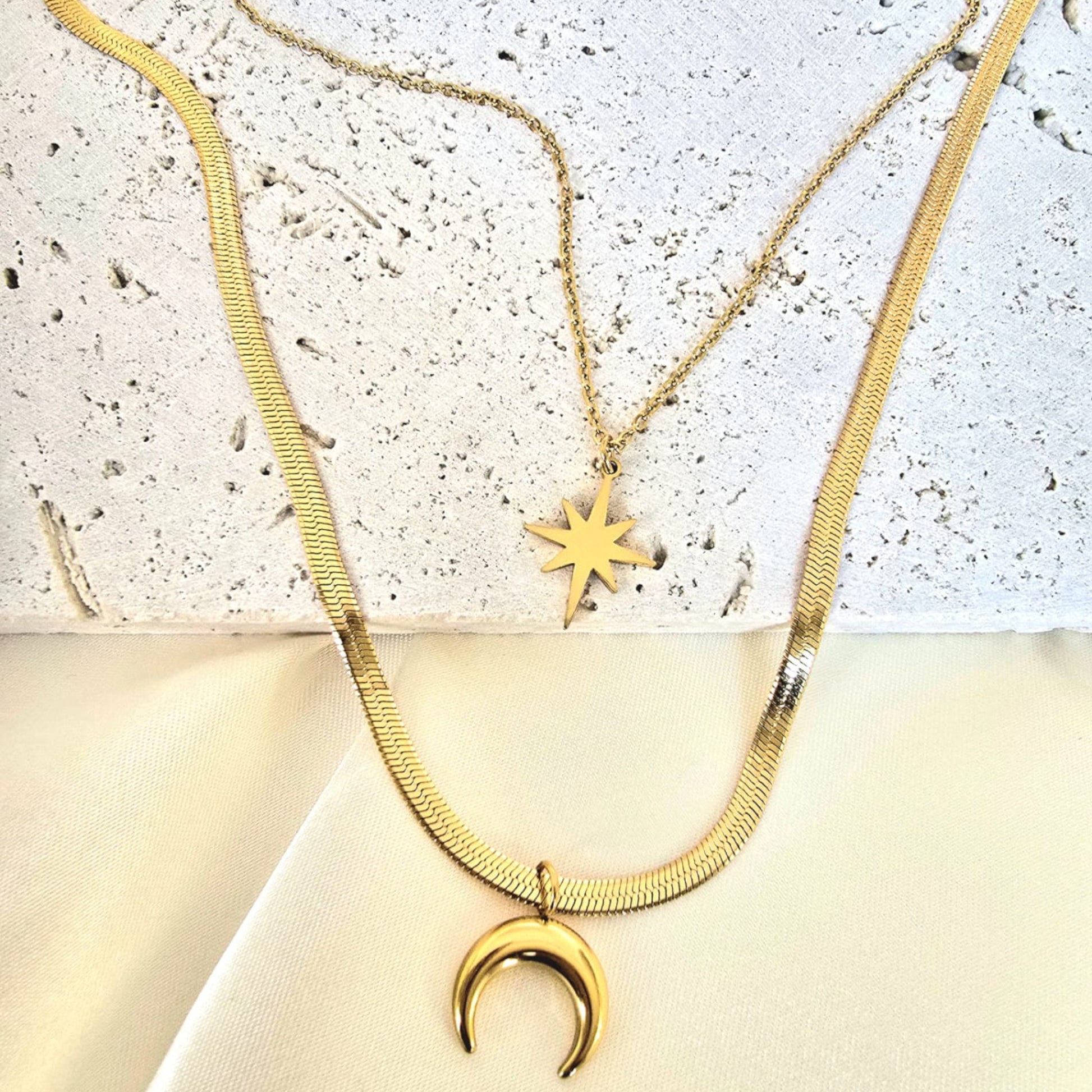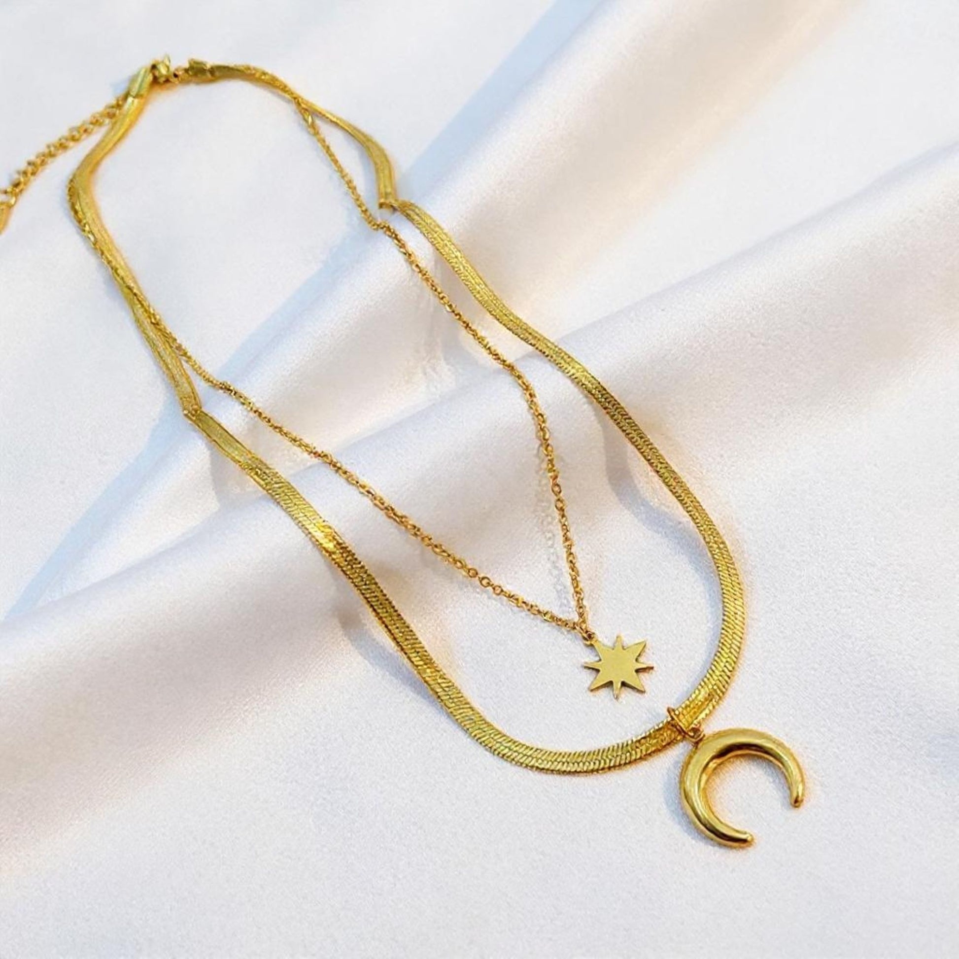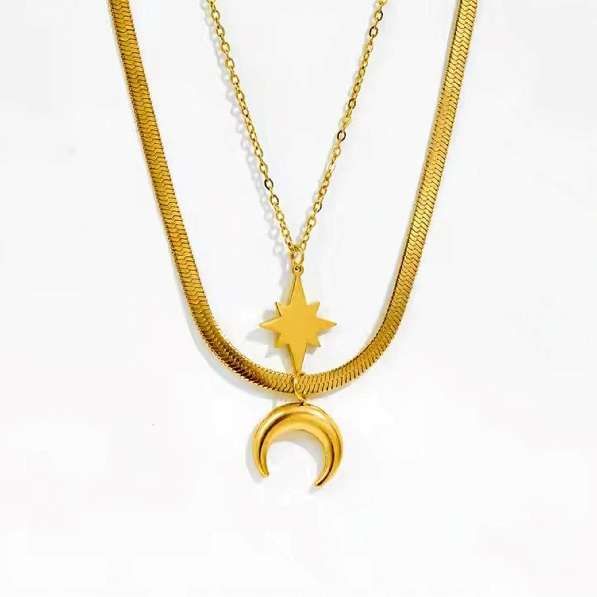 Elevate your look with this celestial-themed moon and star pendant necklace, crafted with durable 18K yellow gold-Plated stainless steel. Featuring a trendy double-layered design and sleek snake chain, this necklace offers both elegance and edge—perfect for both day and night wear.