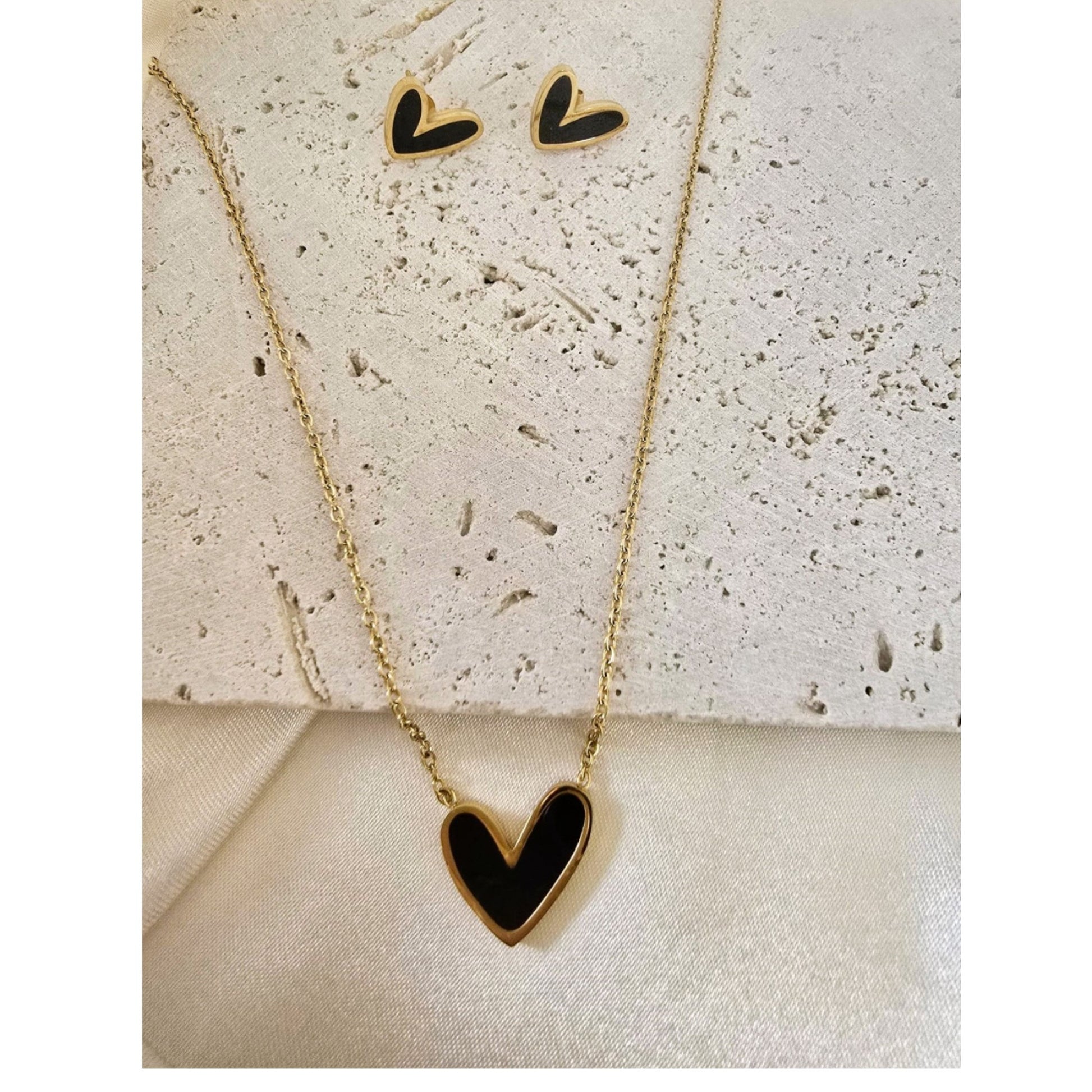 18K Yellow Gold-Plated Jewelry Set Black Heart Earrings & Pendant Necklace