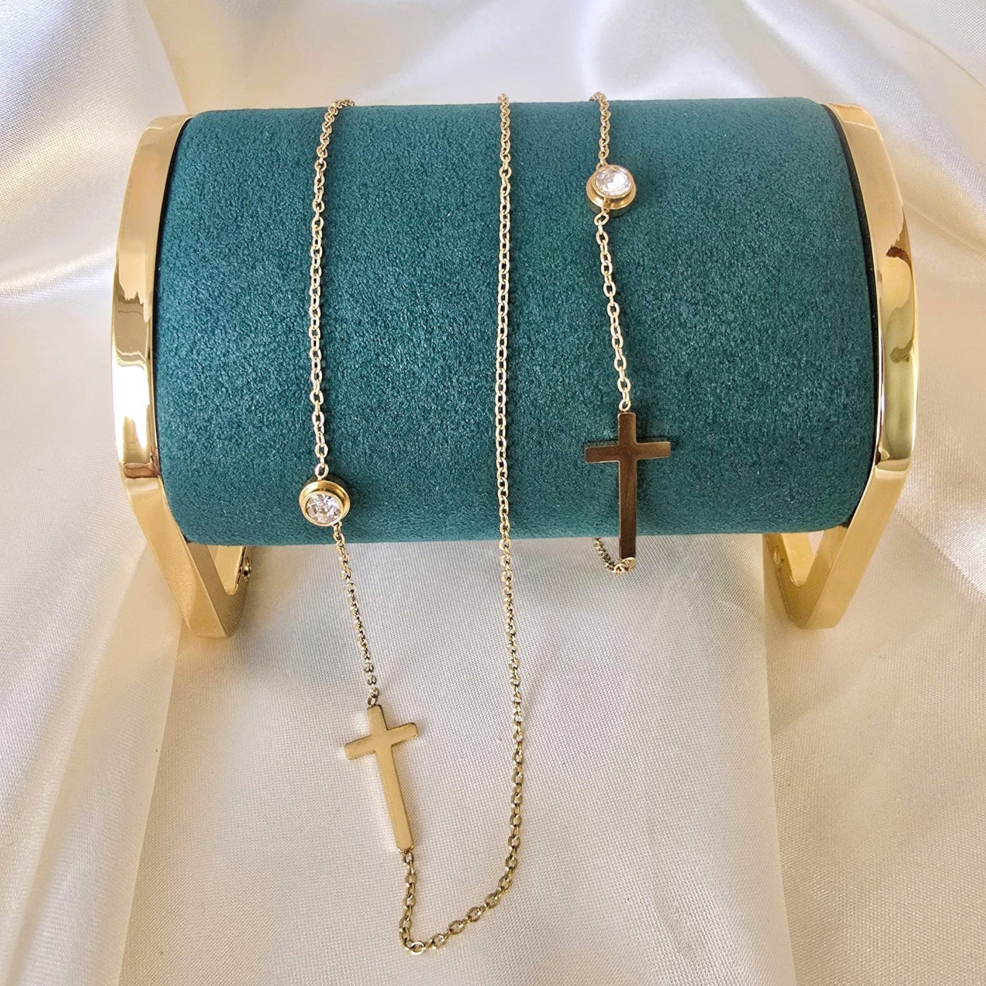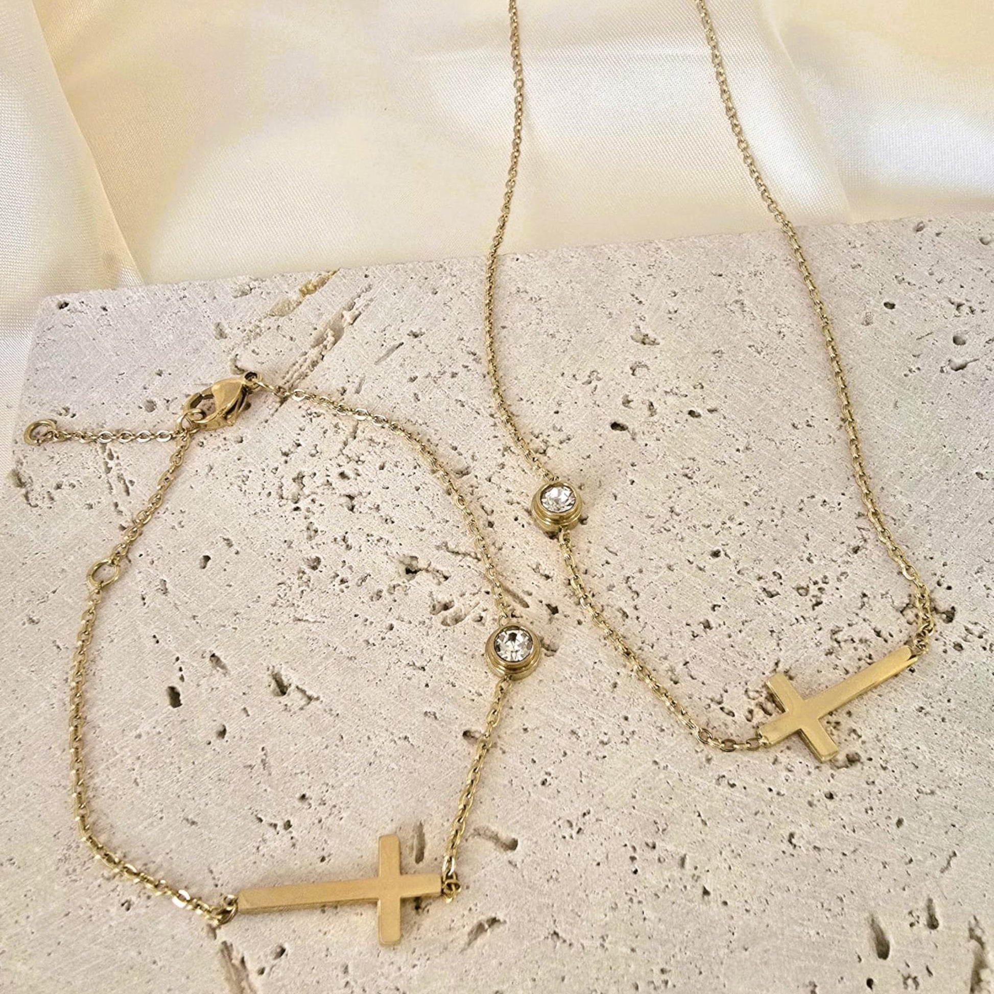 This elegant Cross Station Necklace and Bracelet Set from LAPRECIEUZ DE ARTHES is crafted in radiant 18K yellow gold-Plated finish, featuring delicately spaced cross charms that symbolize faith, hope, and grace.