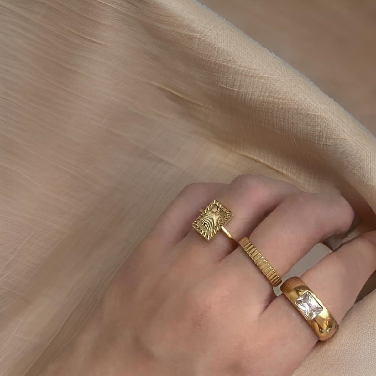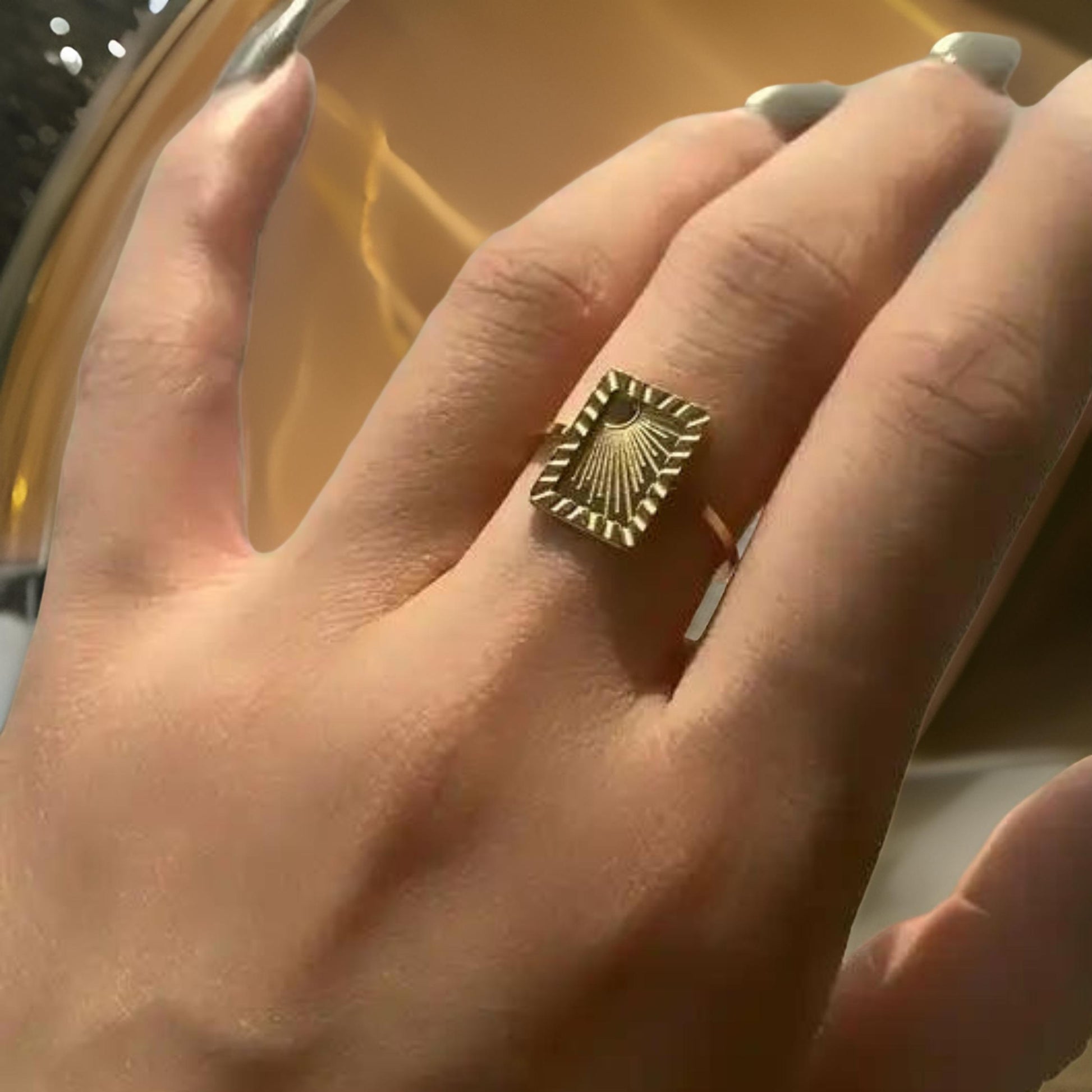 Be bold with the SUN SQUARE Ring! This 18k Gold Stainless Steel piece is both strong and beautiful, sure to make an impact. Plus, it won’t tarnish, so you can carry your zodiac sign with you no matter where you go. Conquer the world with your personal style!